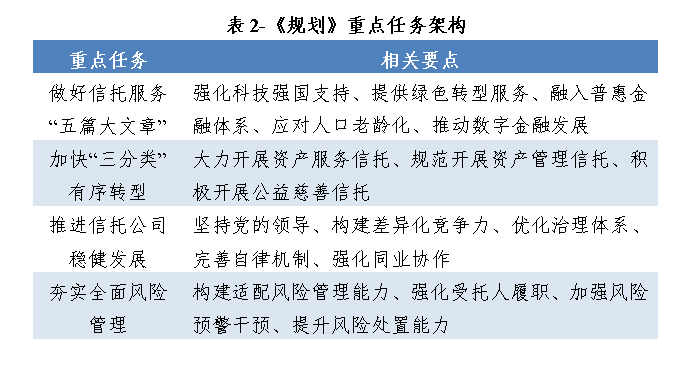 《规划》基于“助力金融强国建设,服务中国式现代化大局”核心目标,明确四项重点任务,形成“服务战略+转型本源+机构稳健+风险防控”的驱动体系。其中前两大重点任务尤为关键:一是服务“五篇大文章”方面,明确中短期与长期的分层推进路径,如科技金融领域中短期提供资金支持与知识产权信托服务,长期提供权益资本与综合服务平台;养老金融领域构建“养老金金融+养老服务金融+养老产业金融”协同体系。二是推动“三分类”转型方面,对资产服务信托细化为财富管理、行政管理、资产证券化、风险处置四大细分方向,要求长期成为行业标志性业务;对资产管理信托强调提升投研与风控能力,规范资金募集行为。