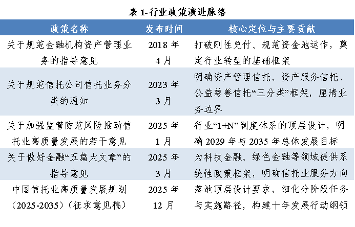 《规划》明确了行业发展的时代背景,立足四大核心维度构建发展逻辑。一是中国式现代化提出新要求,需发挥信托机制优势服务高质量发展、助力共同富裕、促进人与自然和谐共生;二是金融强国赋予新使命,要求牢牢把握金融工作的政治性与人民性,坚守服务实体经济宗旨,走好中国特色信托发展之路;三是党和国家指明新方向,以《意见》为顶层设计,以“五篇大文章”相关政策为具体指引,构建“1+N”制度体系;四是行业共同愿景驱动新路径,当前行业已形成高质量发展共识,市场需求潜力深厚,但仍面临业务结构不合理、同质化竞争严重等挑战。截至2024年末,全行业管理信托资产余额达29.56万亿元,其中服务实体经济规模16.68万亿元,为转型发展奠定坚实基础。从行业政策演进脉络看,《规划》是近年监管政策的延续与深化,共同构建起行业转型的制度框架。