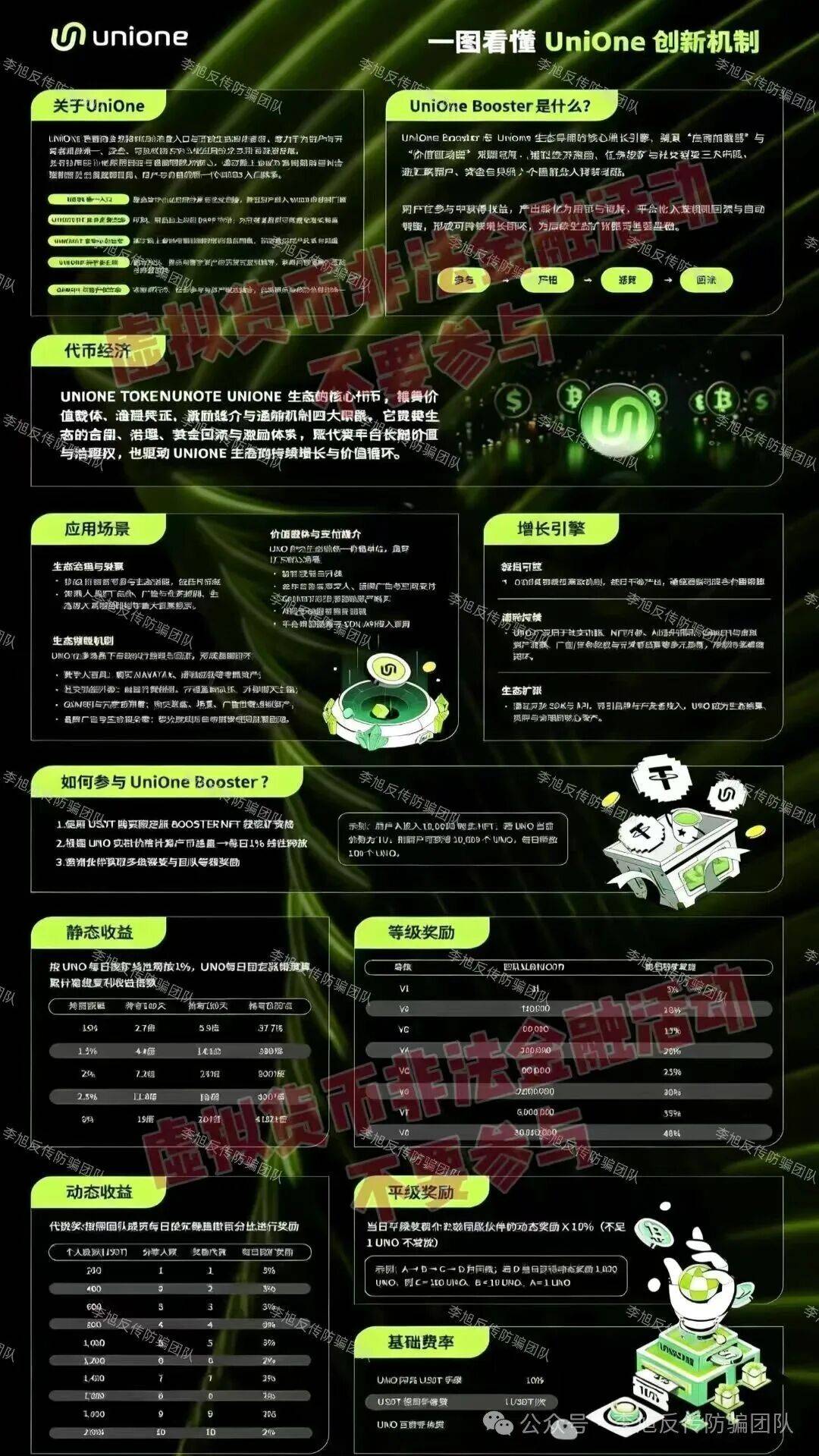 披着区块链、NFT的外衣,要求用户购买“Booster NFT”获得挖矿资格,承诺静态年化收益高达37倍。动态模式设置了多层团队计酬,拉人头提升等级。其发行的“UNO币”没有任何真实资产支撑,币价全靠平台自己操盘。